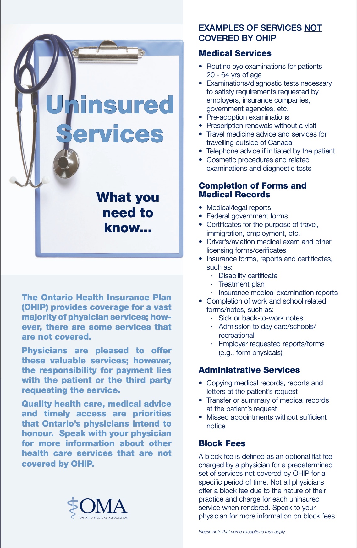 As many of you may already know, OHIP does not pay for all services that you request from your doctor. These are called “non-insured or uninsured services” and it is illegal and fraudulent for doctors to bill OHIP for them. In order to maintain the financial viability of our practice and ensure prompt service, it is necessary for our practice to charge for these services.